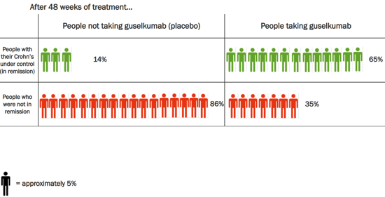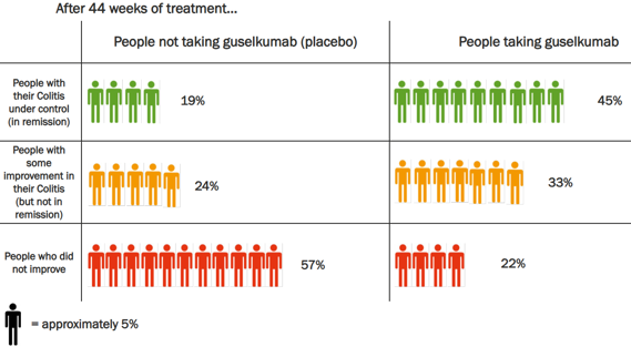 After 12 weeks of taking intravenous guselkumab, around 6 in every 10 people, or 62%, showed some improvement. And just over 2 in every 10 people, or 23%, were in remission.