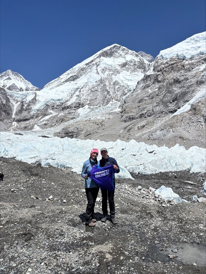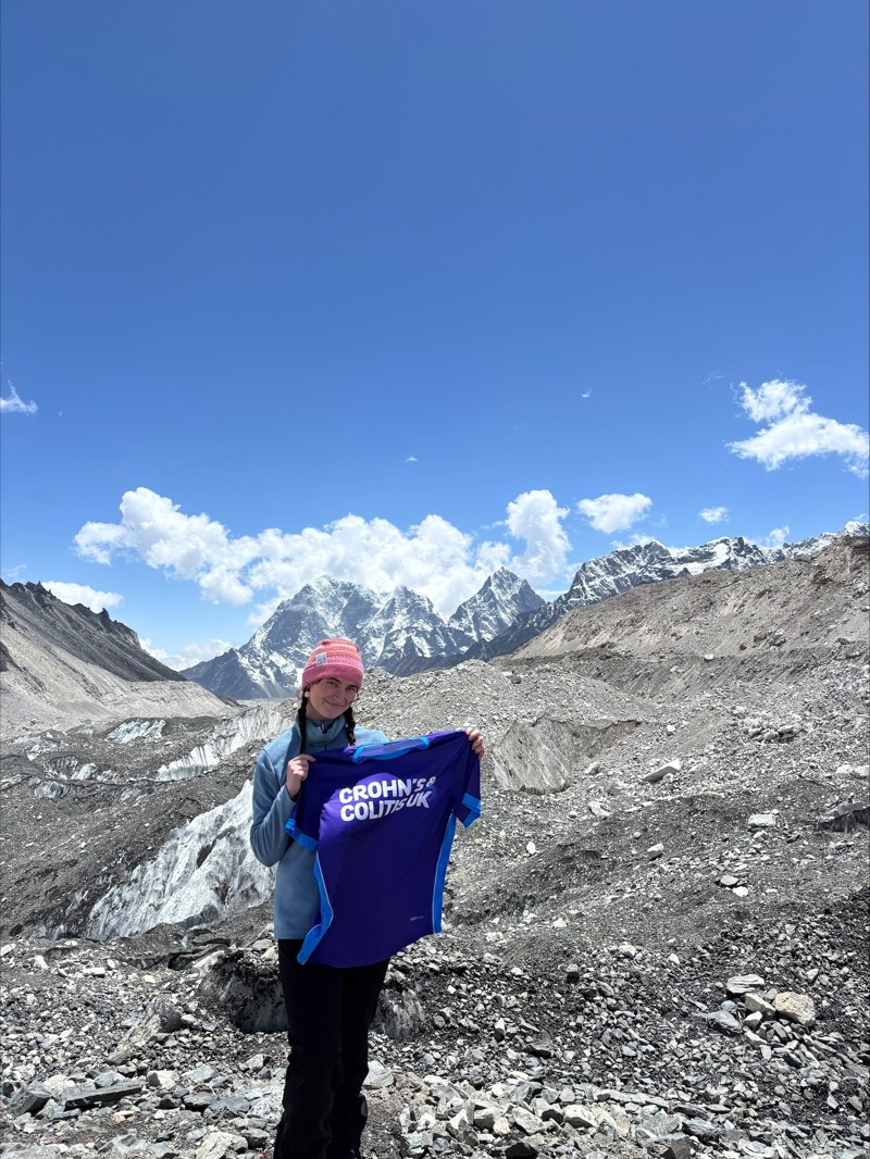 Jenna stands at Mount Everest Base Camp with her Crohn's & Colitis UK T -shirt