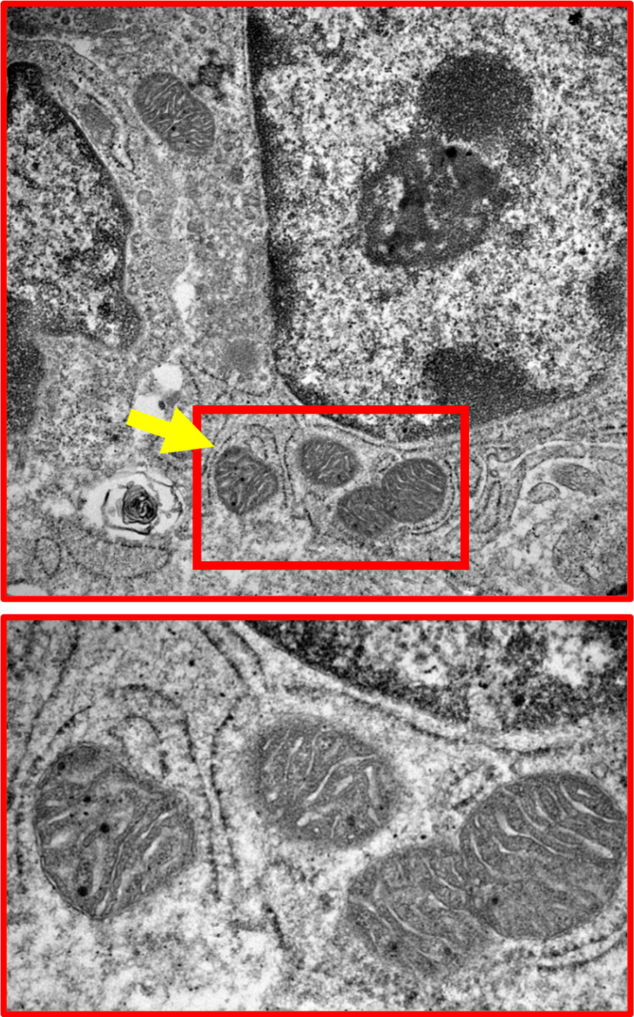 Figure 1: Mitochondria (‘Batteries’ or ‘Powerstations’) in the gut lining cells (yellow arrows). All cells have mitochondria, which are descended from ancient bacteria 3 billion years ago. Mitochondria produce energy for cells but are also important for many other functions including in controlling immune and inflammation responses. Electron micrograph with magnification of >100 times.